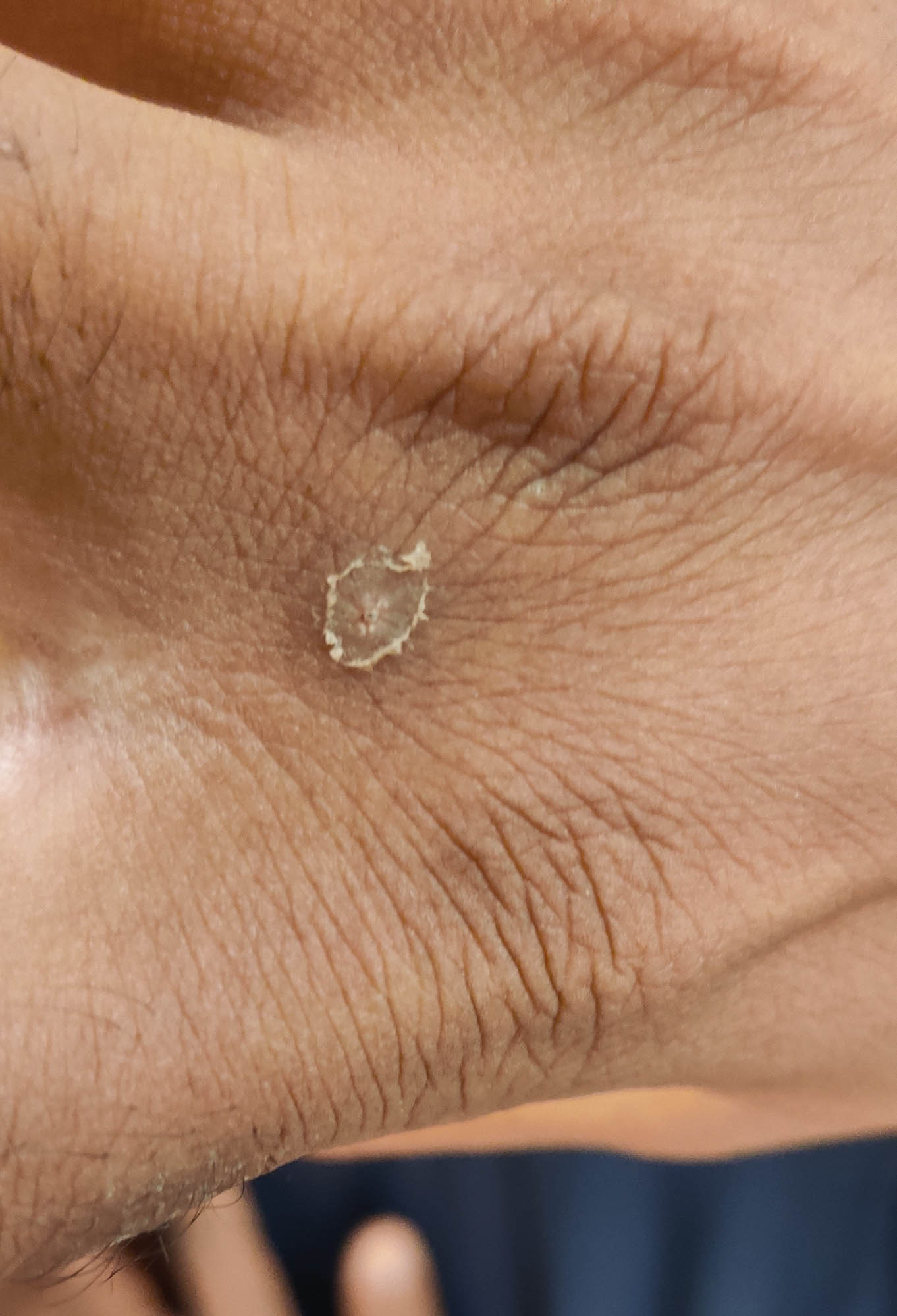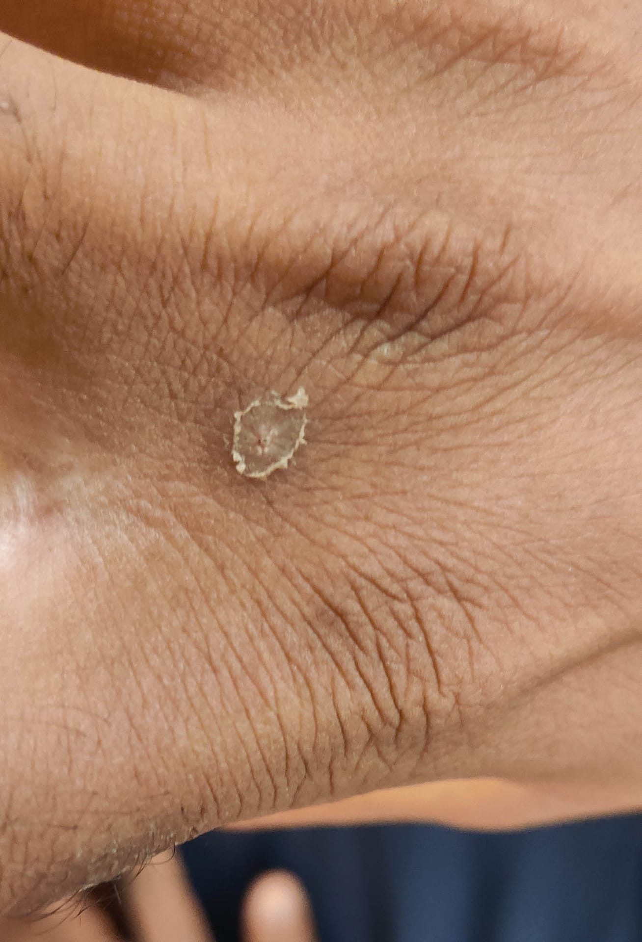 Healing interdigital ulcer in a 42 year old HIV-negative, unvaccinated cisgender man of South Asian descent. This image was taken 17 days after onset of his initial symptoms. This lesion was part of a secondary crop of lesions that appeared after his acute stage of illness.