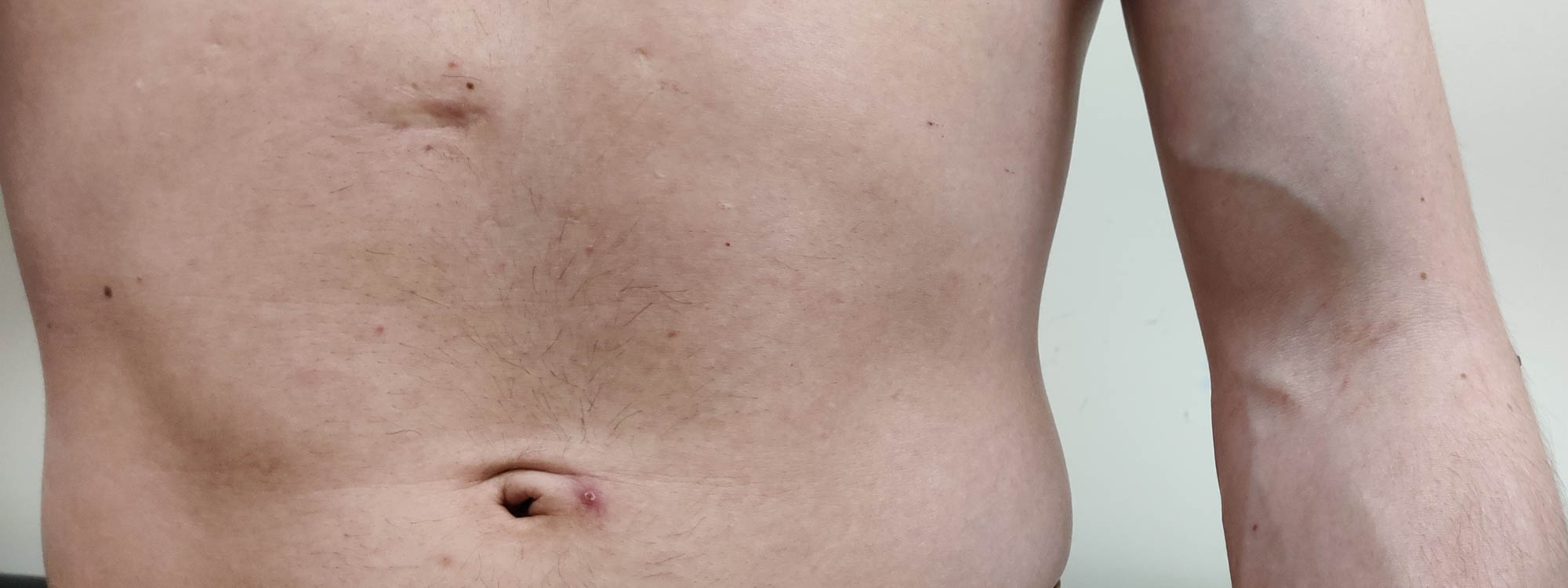 Papular lesions of varying sizes over the abdomen of a 30 year old HIV-negative white cisgender man, 11 days after symptom onset and 7 days after 1st dose of MVA-BN vaccine