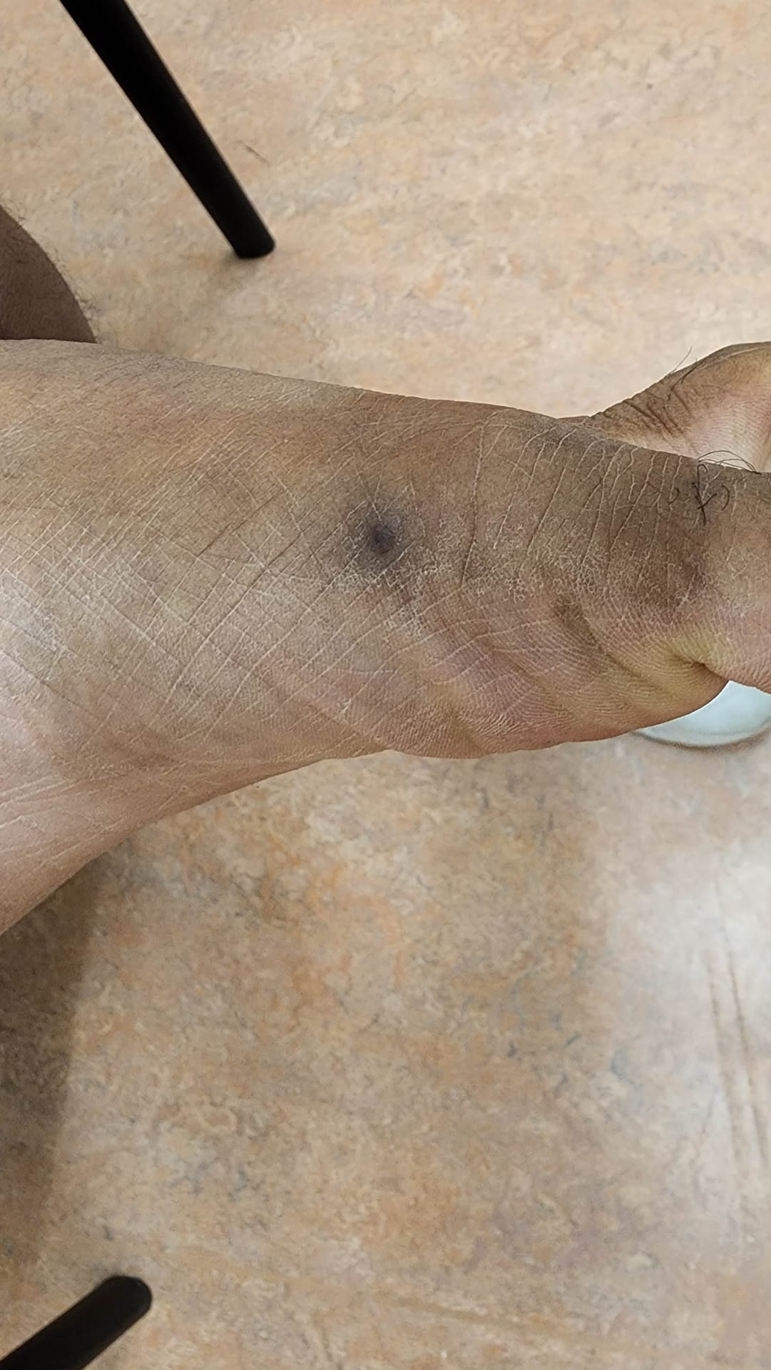 Scabbed papule on the left foot of a 42 year old HIV-negative, unvaccinated cisgender man of South Asian descent. This image was taken 25 days after onset of his initial symptoms. This lesion was part of a secondary crop of lesions that appeared after his acute stage of illness.