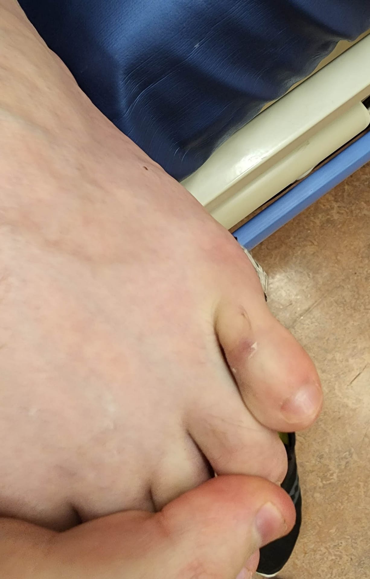Nearly resolved shallow ulcer on the dorsum of the toe of a 30-year old white cisgender man with scant residual desquamation. This image was taken 26 days after symptom onset and 29 days after a 1st dose of MVA-BN vaccine.