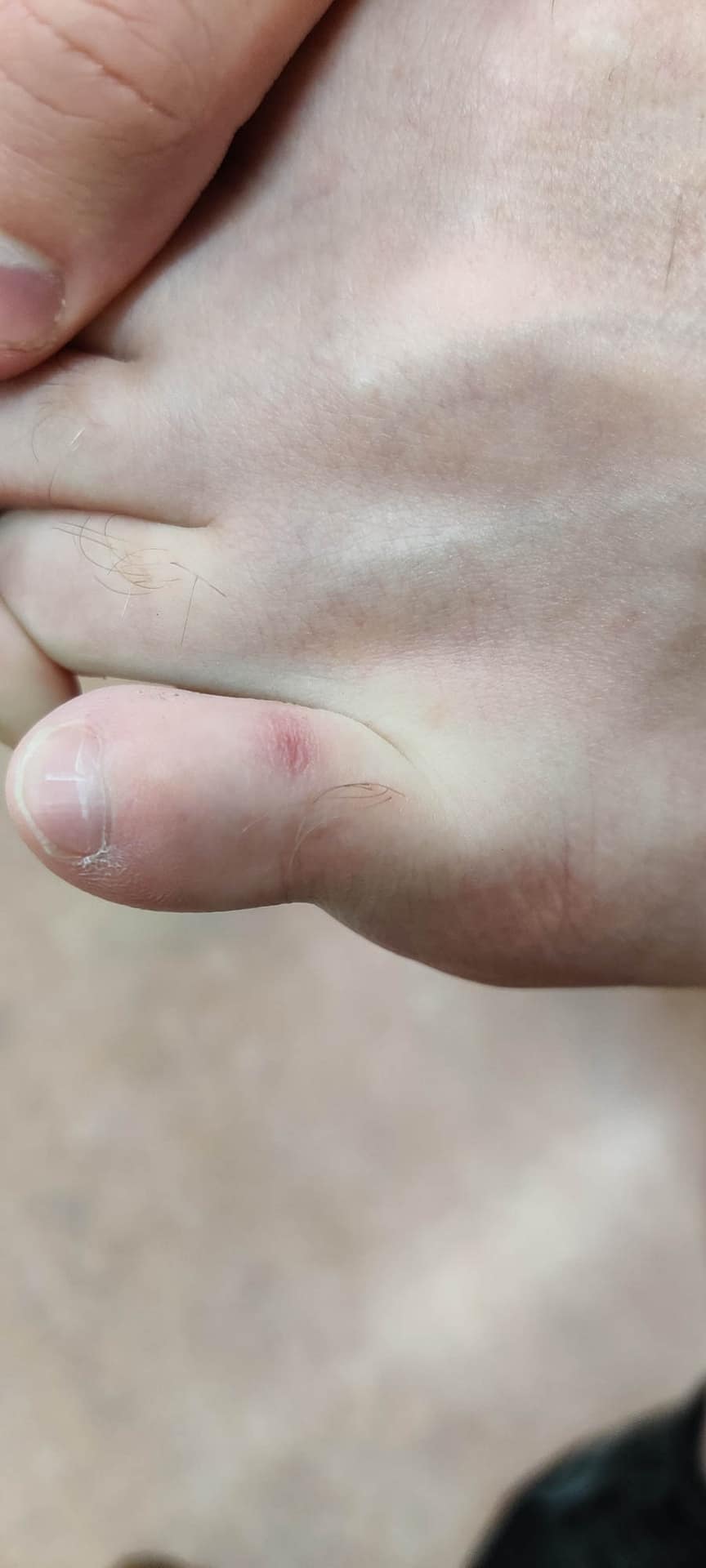 Resolved shallow ulcer on the dorsum of the toe of a 30-year old white cisgender man with scant residual desquamation. This image was taken 33 days after symptom onset and 36 days after a 1st dose of MVA-BN vaccine.